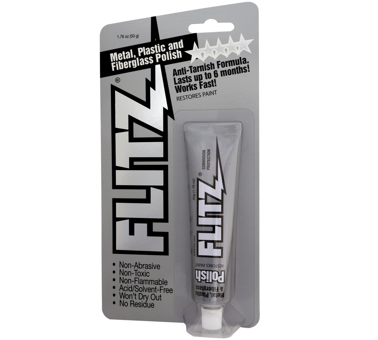 It will remove scuff marks on your fiberglass, plexiglas, and painted surfaces without scratches. Remove your water hard spots, and many other stains. Flitz Safely Removes: Tarnish, Rust, Water Stains Chalking, Lime Deposits Heat Discoloration Lead & Powder Residue, Oxidation Bugs, Tar, Oil Fingerprints Bird Droppings, Graffiti, and Dyes Flitz is: Non-Abrasive Non-Toxic Acid-Free Won't Dry Out No Residue!