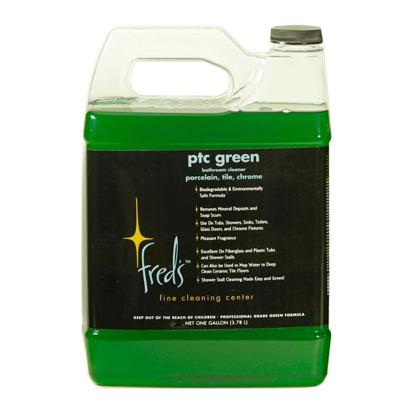 Fred’s PTC Green Bathroom Cleaner is a Green-friendly formula that safely removes hard water deposits, soap scum, and mildew from shower stalls, bathtubs, sinks and toilet bowls. This product eliminates the need for heavy scrubbing and will effectively clean porcelain, chrome and tile. It contains a low pH organic salt that is used to replace traditional mineral and organic acids. Fred’s PTC Green Bathroom Cleaner is safe on most metal, phosphate free, biodegradable, and is non-irritating to skin. Fred’s PTC Green Bathroom Cleaner cleans tubs, showers, sinks, toilets and does an excellent job on chrome fixtures.