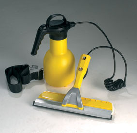 Window washing made easy! Professional results without a bucket. Pressurized bottle holds cleaning solution (water & glass soap). Simply press the button on the professional grade squeegee / soaper and out comes the solution onto the window, scrub clean, squeegee dry. Included strap holds bottle to allow for single handed operation.