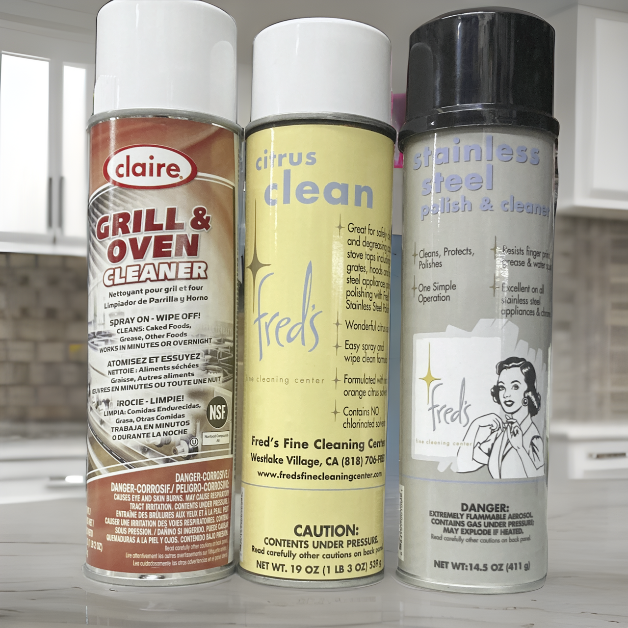 These three products pair together wonderfully to help you clean the greasiest of appliances. If your grill hasn't been cleaned in a while or you want to maintain a new one, this trio is exactly what you need! The Claire Grill & Oven Cleaner is used to clean off all the built up food and grease, the Fred's Citrus Clean keeps the outside clean, and the Fred's Stainless Steel Polish and Cleaner helps to maintain its shine.