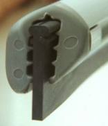 Picture yourself cleaning a window on the 3rd floor of a building and imagine the vinyl seal that surrounds the window frame. Sometimes this will distort the rubber blade and leave water behind. This can be prevented by cutting the rubber blade roughly a 1/4" shorter than the channel which will be 1/8" shorter in each end when centered. Now picture the safe polypropylene end plug gliding safely against the frame without scratching and the rubber blade sliding against the window without bending. (See Fig. 1) You can also trim the corner off for a better fit at a 35 degree angle.(See Fig. 2)